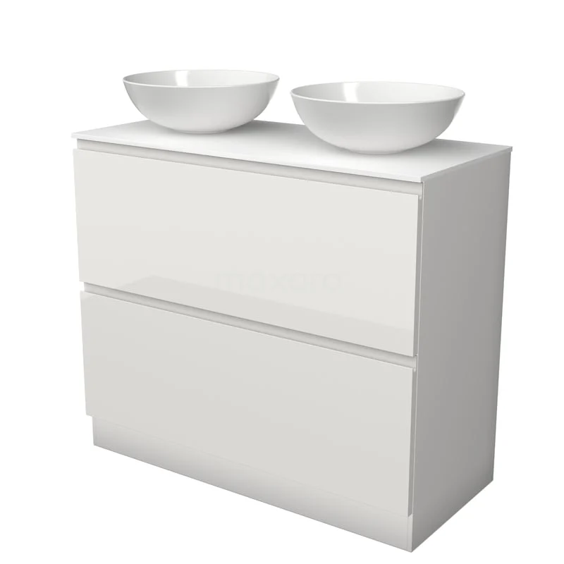 Modulo Plato Badkamermeubel voor waskom | 100 cm Hoogglans wit Greeploos front Solid surface blad 2 hoge lades onder elkaar staand
