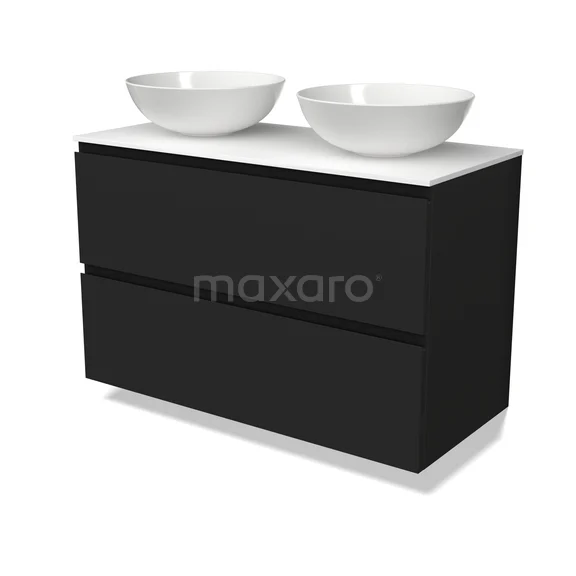 Modulo Plato Badkamermeubel voor waskom | 100 cm Mat zwart Greeploos front Solid surface blad 2 lades onder elkaar
