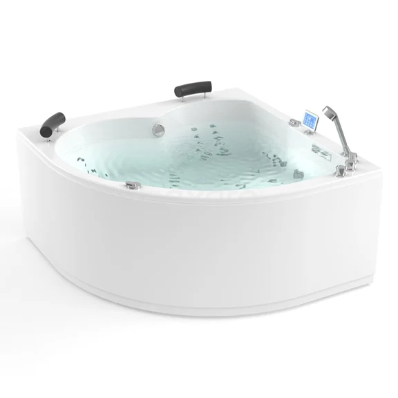 Eckbadewanne mit Hydromassage, weißes Acryl, luxuriöses Design und integrierten Kopfstützen; perfekt für ein entspannendes Badezimmererlebnis.