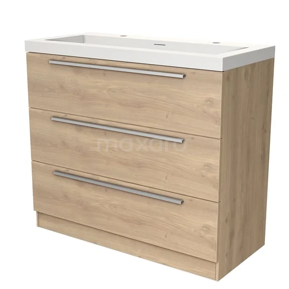 Badmöbel 100cm Modulo Hellbraune Eiche 3 Schubladen Stehendes Waschbecken Solid Surface
