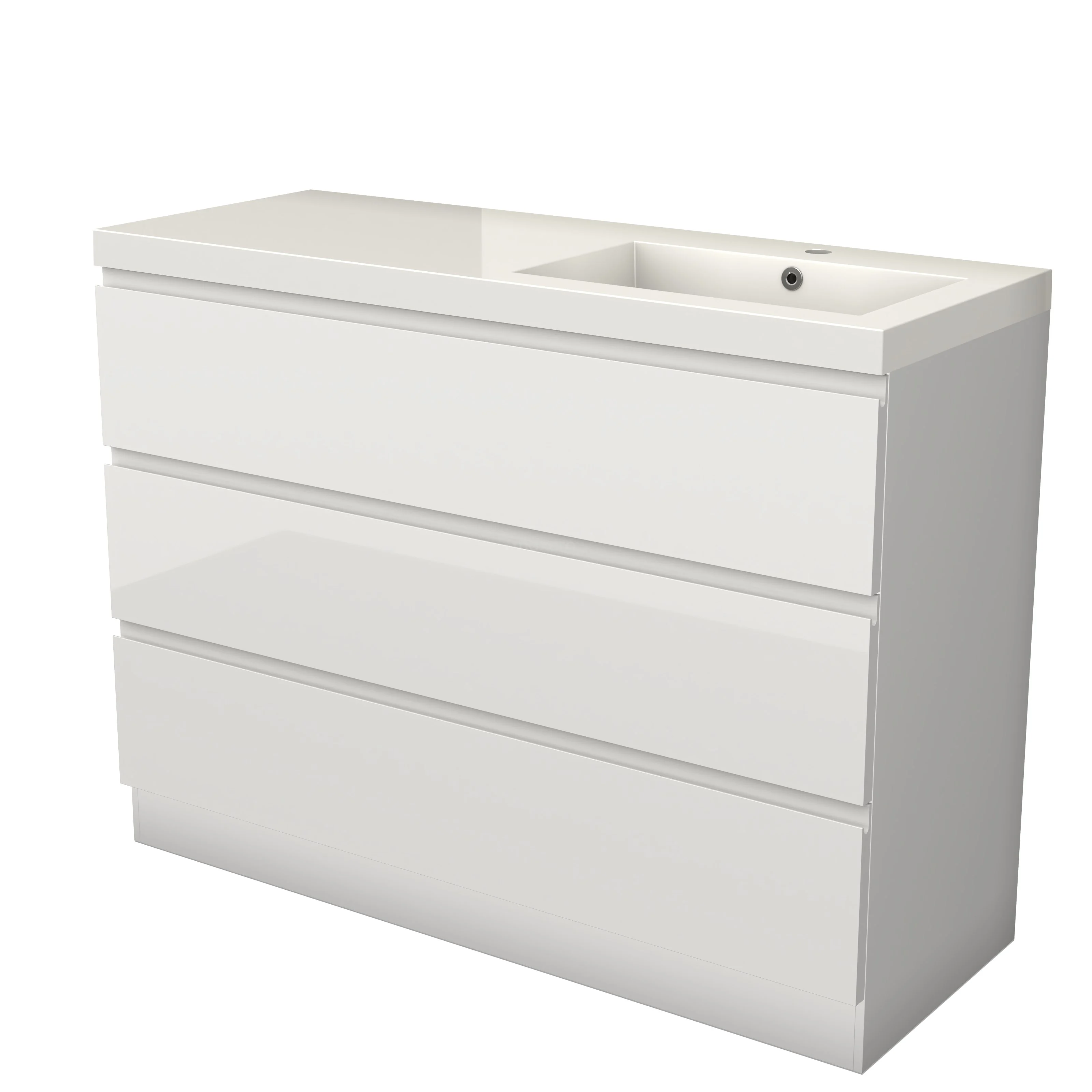 Das bodenstehende Badmöbel (120 cm) ist das Herzstück für die tägliche Körperpflege wie Schminken, Rasieren oder Zähneputzen. Das Waschbecken hat 2 Hahnlöcher und ist ideal für die gleichzeitige Nutzung durch mehrere Personen. Das Möbel bietet außerdem genügend Platz, um Ihre WC- und Pflegeprodukte ordentlich zu verstauen.