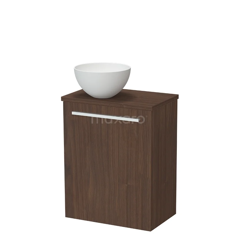 Holz-Badmöbel mit dunkelbrauner Oberfläche, integrierter Schublade und weißem rundem Waschbecken, modernes und kompaktes Design.
