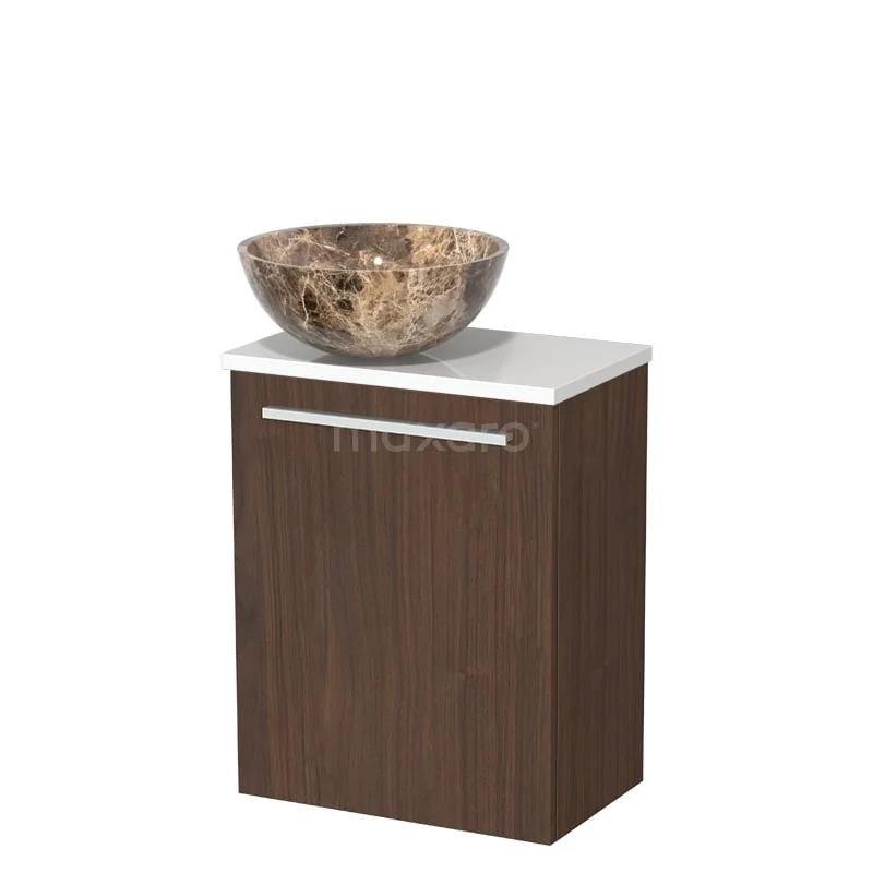 Kompakte Holz-Badmöbel mit Marmor-Aufsatzwaschbecken, Matt Weiß Platte und Metallgriff, ideal für ein modernes Badezimmer.
