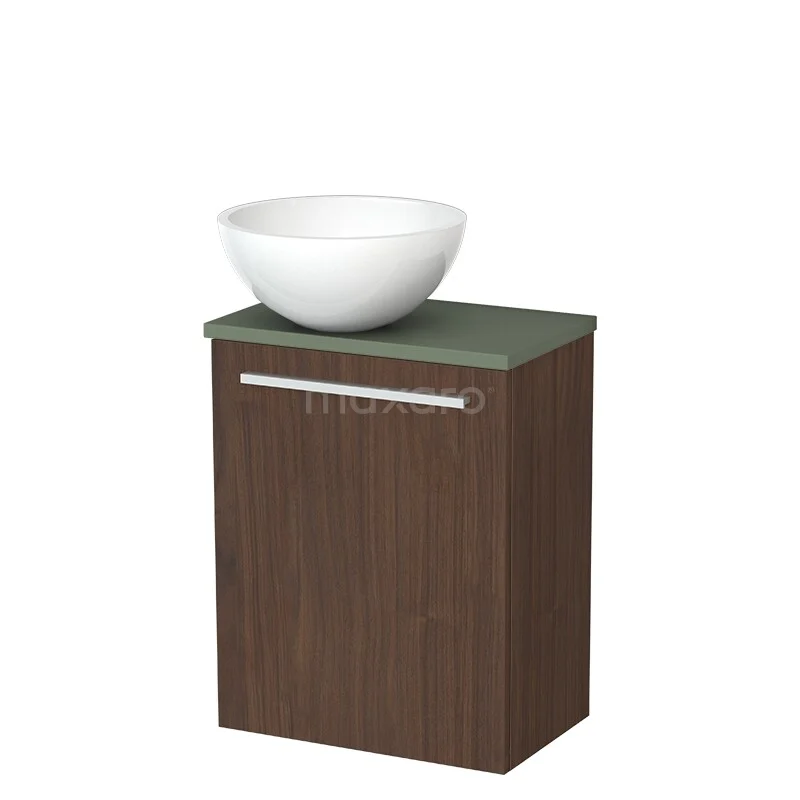 Dunkelholz Badschrank mit einem weißen keramischen Aufsatzwaschbecken-Design und einer grünen Marmorplatte. Kompakt, modern und stilvoll.