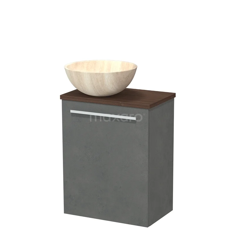 Grauer Badschrank mit Holzlook Platte und Natursteine Aufsatzwaschbecken, kompaktes Design aus moderner Badmöbelkollektion.