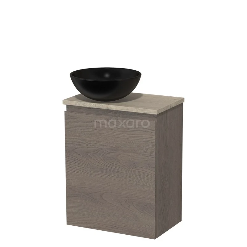 WC-Möbel mit Aufsatzwaschbecken | 41 cm Dunkelbraune Eiche Grifflose Front Matt Schwarz Keramik Aufsatzwaschbecken Hellgraue Eiche Platte