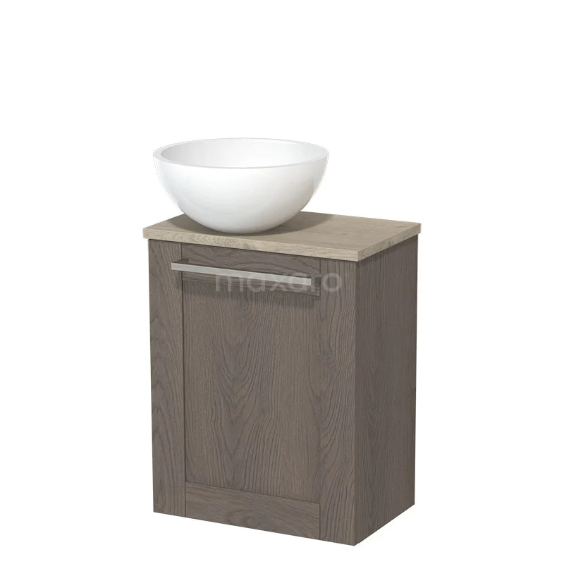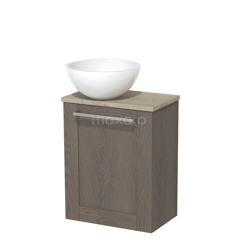 WC-Möbel mit Aufsatzwaschbecken | 41 cm dunkelbraune Eiche Rahmenfront Hochglanz Weiß Mineralguss Aufsatzwaschbecken hellgraue Eiche Platte