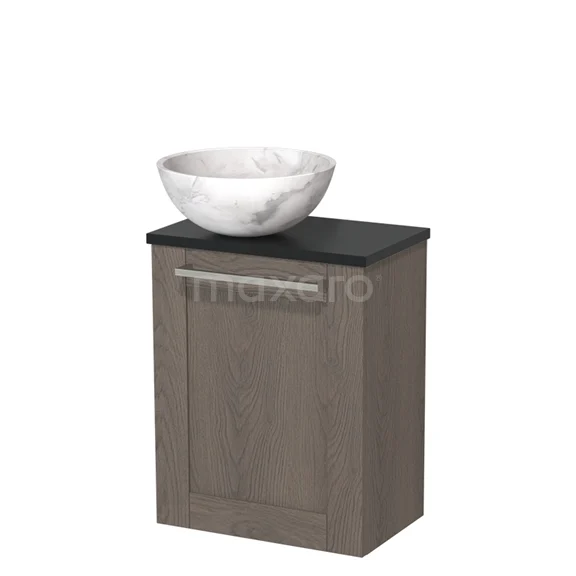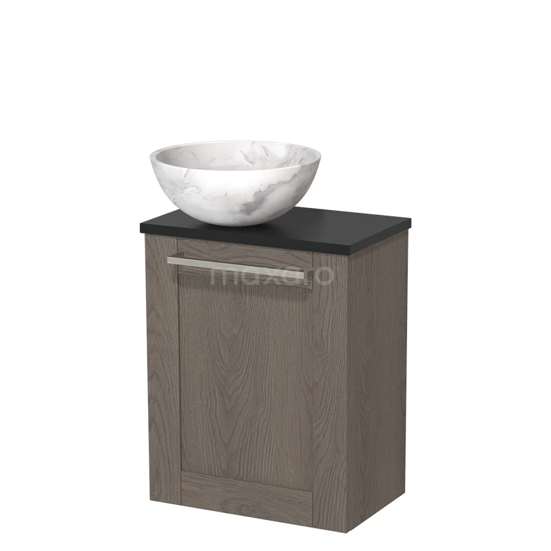 WC-Möbel mit Aufsatzwaschbecken | 41 cm Dunkelbraune Eiche Rahmenfront Weißer Marmor Aufsatzwaschbecken aus Naturstein Matt Schwarz Platte