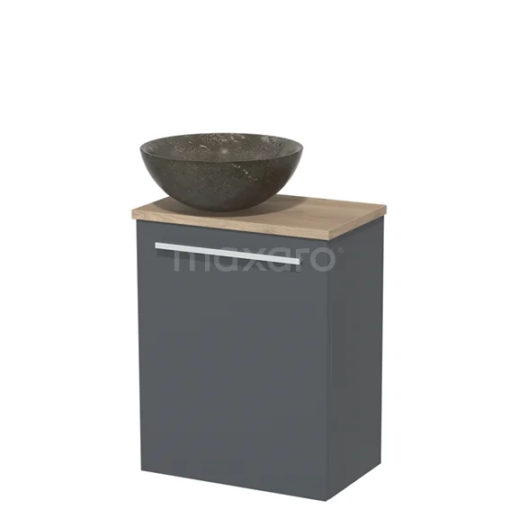 WC-Möbel mit Aufsatzwaschbecken | 41 cm Dunkelgrau Glatte Front Blaustein Naturstein-Aufsatzwaschbecken Hellbraune Eiche Platte