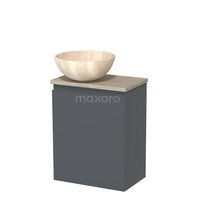 WC-Möbel mit Aufsatzwaschbecken | 41 cm Dunkelgrau grifflose Front Travertin Naturstein-Aufsatzwaschbecken hellgraue Eiche