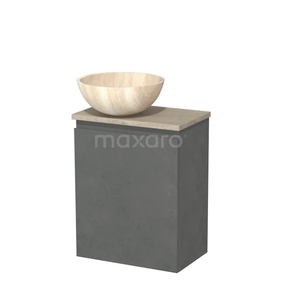 WC-Möbel mit Aufsatzwaschbecken | 41 cm Dunkelgrauer Beton Grifflose Front Travertin Naturstein Aufsatzwaschbecken Hellgraue Eiche Platte