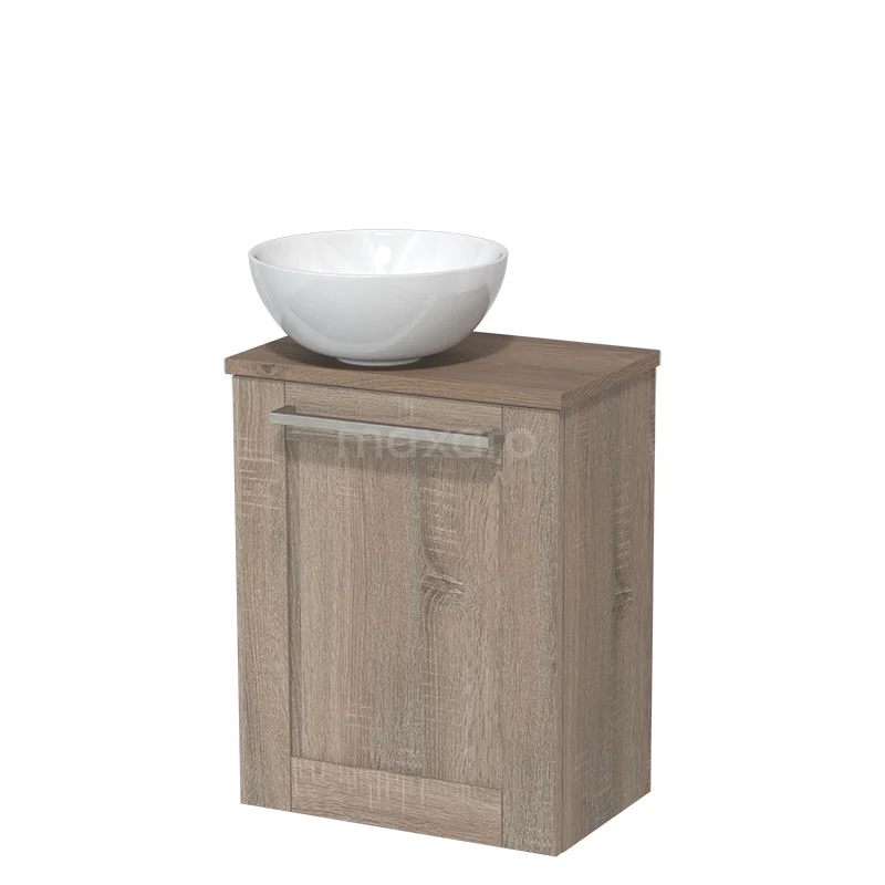 WC-Möbel mit Aufsatzwaschbecken | 41 cm Eiche Rahmenfront Hochglanz Weiß Keramik-Aufsatzwaschbecken Mittelbraune Eiche Platte