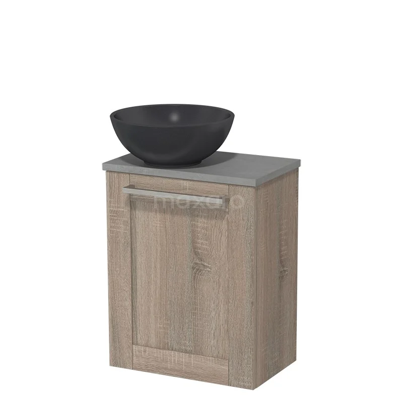 WC-Möbel mit Aufsatzwaschbecken | 41 cm Eiche Rahmenfront Matt Schwarz Quarz Aufsatzwaschbecken Hellgrauer Beton Platte