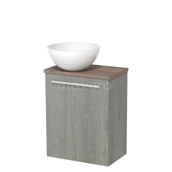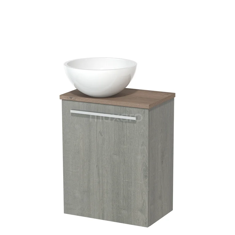 WC-Möbel mit Aufsatzwaschbecken | 41 cm Grau Eiche Glatte Front Hochglanz Weiß Mineralguss Aufsatzwaschbecken Mittelbraune Eiche Platte