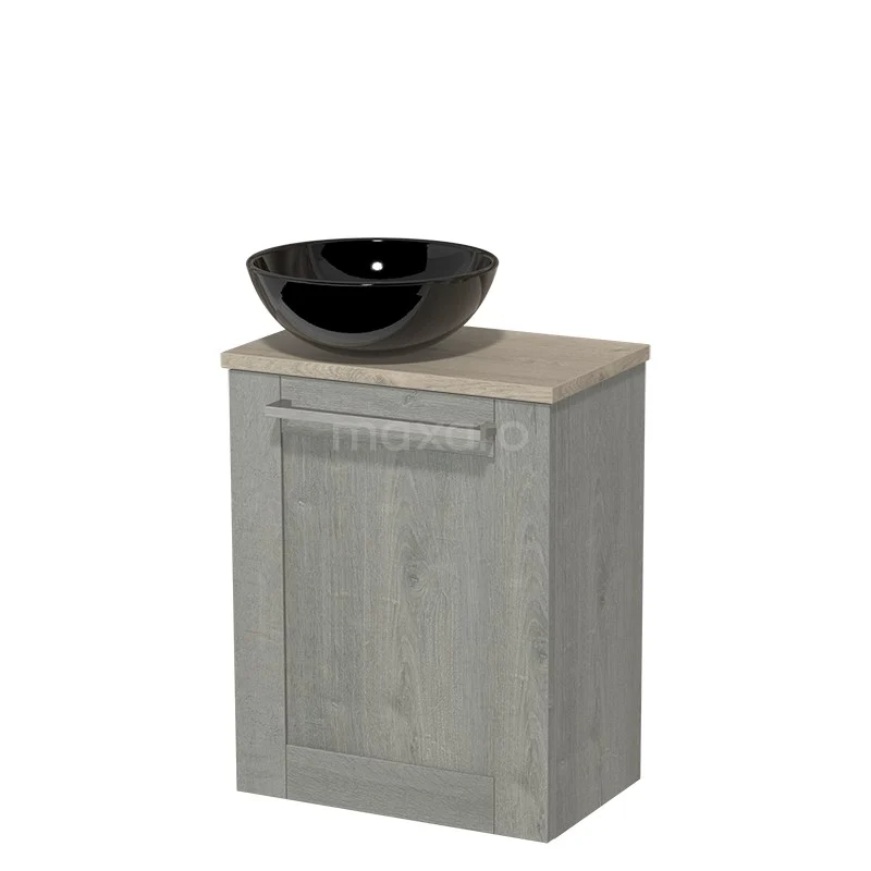 WC-Möbel mit Aufsatzwaschbecken | 41 cm Grau Eiche Rahmen Front Hochglanz Schwarz Keramik Aufsatzwaschbecken Hellgraue Eiche Platte