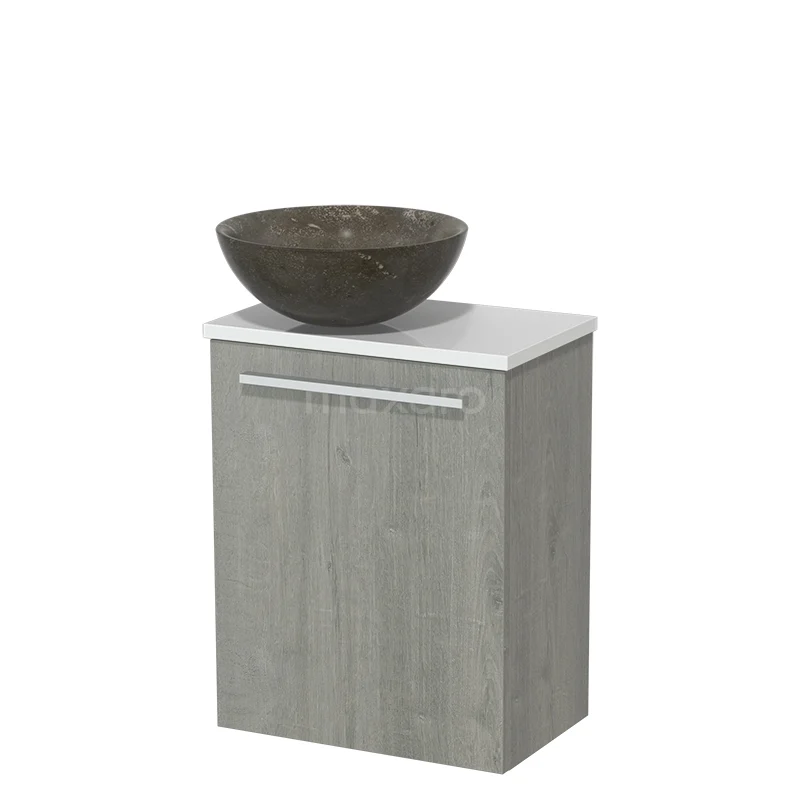 WC-Möbel mit Aufsatzwaschbecken | 41 cm Graue Eiche Glatte Front Blaustein Naturstein Aufsatzwaschbecken Hochglanz Weiß