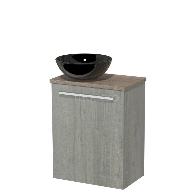 WC-Möbel mit Aufsatzwaschbecken | 41 cm Graue Eiche Glatte Front Hochglanz Schwarz Keramik Aufsatzwaschbecken Eiche Platte