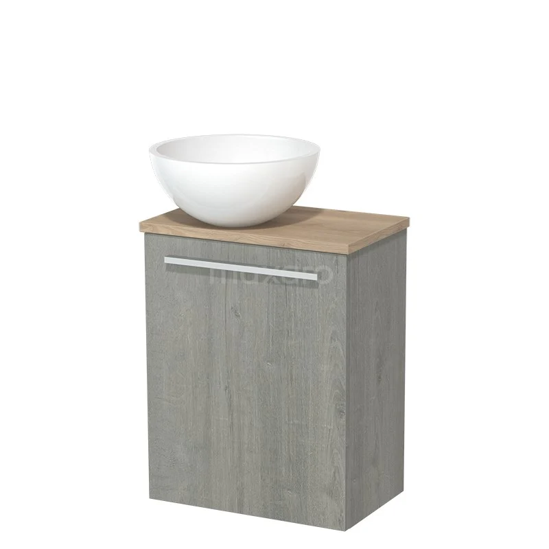 WC-Möbel mit Aufsatzwaschbecken | 41 cm Graue Eiche Glatte Front Hochglanz Weiß Mineralguss Aufsatzwaschbecken Hellbraune Eiche Platte