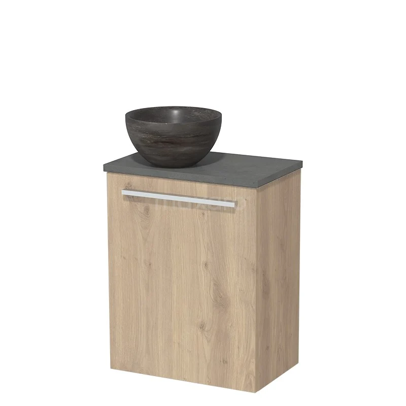 WC-Möbel mit Aufsatzwaschbecken | 41 cm Hellbraune Eiche Glatte Front Blaustein Naturstein Aufsatzwaschbecken Dunkelgrauer Beton Platte