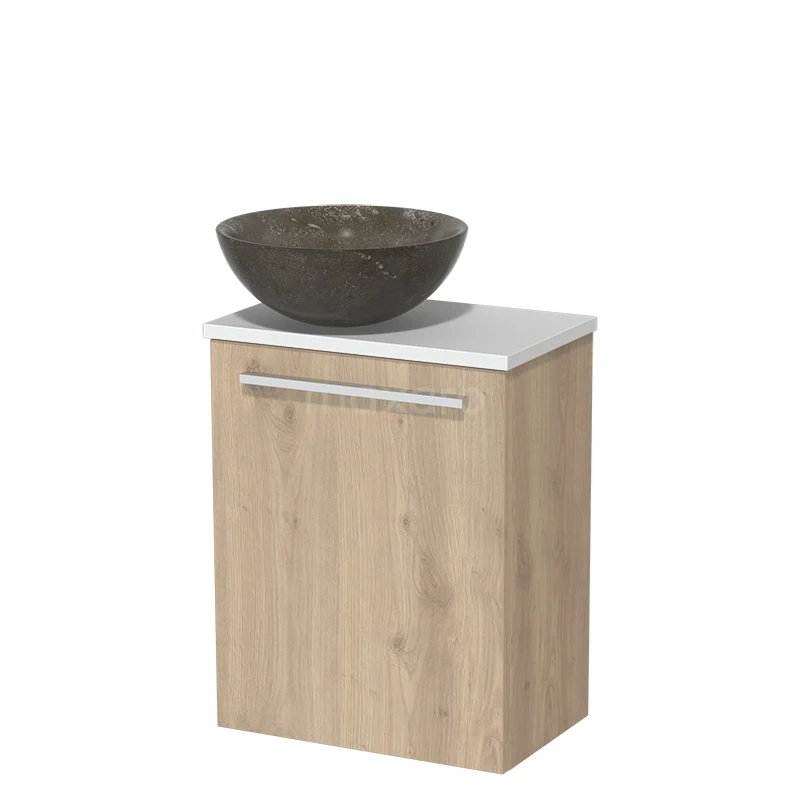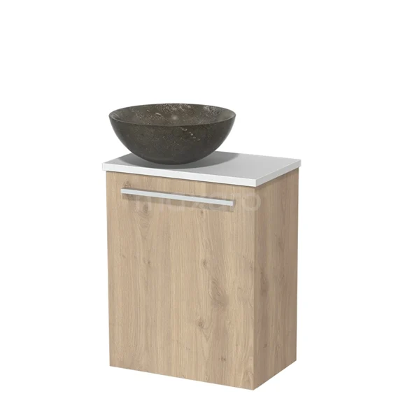 WC-Möbel mit Aufsatzwaschbecken | 41 cm Hellbraune Eiche Glatte Front Blaustein Naturstein Aufsatzwaschbecken Matt Weiß Platte