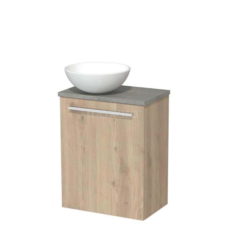 WC-Möbel mit Aufsatzwaschbecken | 41 cm Hellbraune Eiche Glatte Front Matt Weiß Keramik Aufsatzwaschbecken Graue Eiche Platte