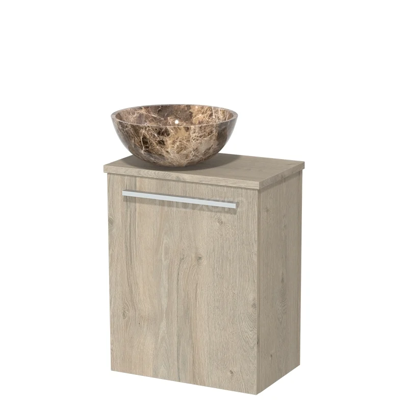 WC-Möbel mit Aufsatzwaschbecken | 41 cm Hellgraue Eiche Glatte Front Dunkles Aufsatzwaschbecken aus Naturstein Hellgraue Eiche Platte
