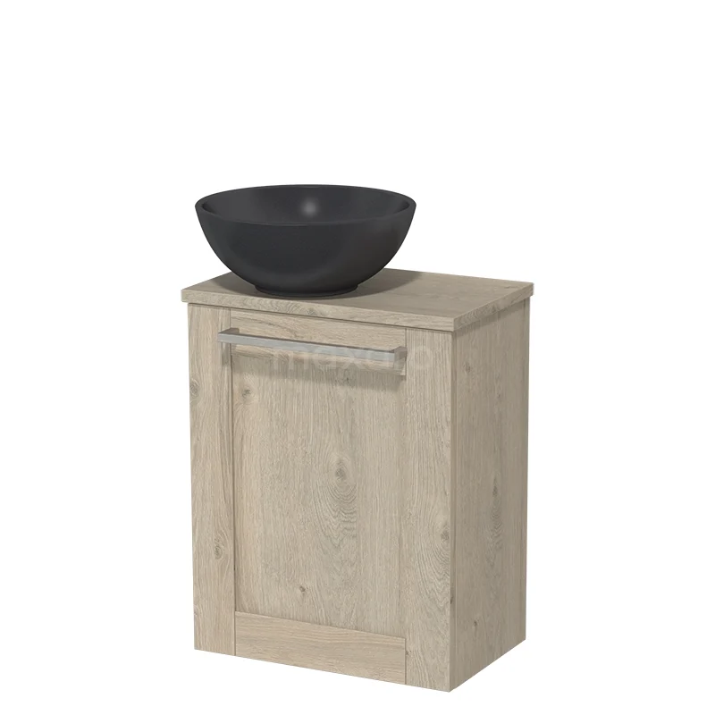 WC-Möbel mit Aufsatzwaschbecken | 41 cm Hellgraue Eiche Rahmenfront Matt Schwarz Quarz Aufsatzwaschbecken Hellgraue Eiche Platte
