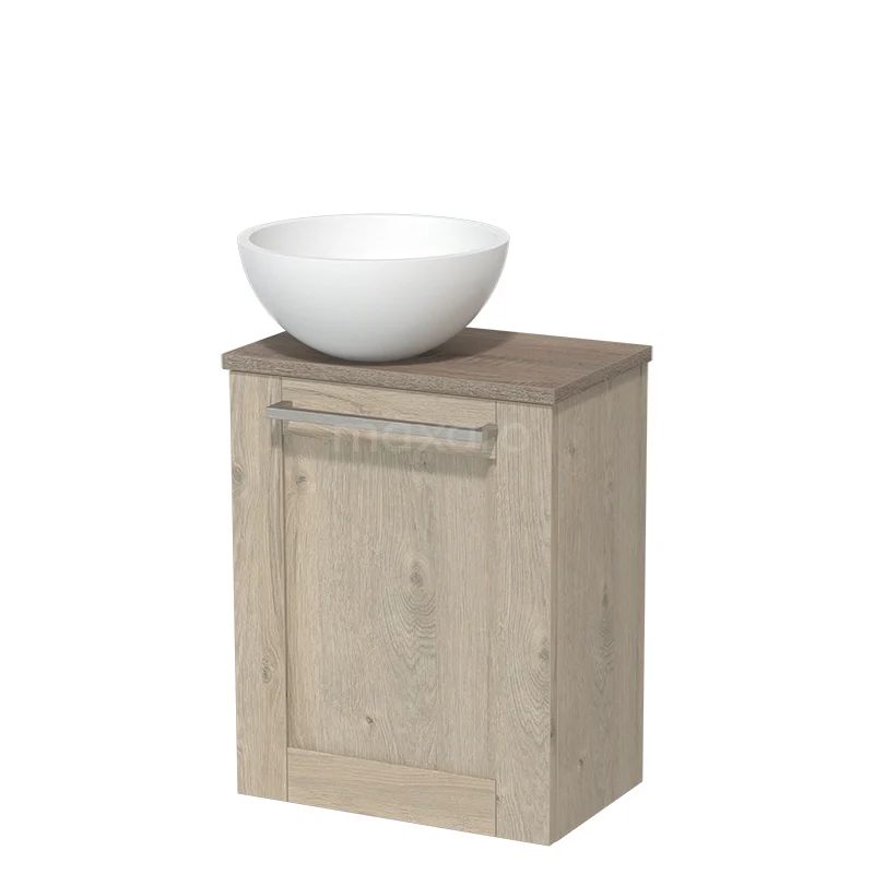 WC-Möbel mit Aufsatzwaschbecken | 41 cm Hellgraue Eiche Rahmenfront Matt Weiß Aufsatzwaschbecken Platte aus Eiche