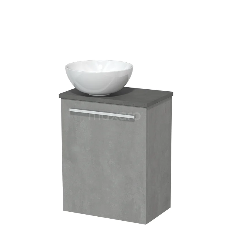 Kompakte graue Waschbeckenunterschrank mit keramischem Aufsatzwaschbecken, modernes Badezimmermöbel aus Betonlook-Material.
