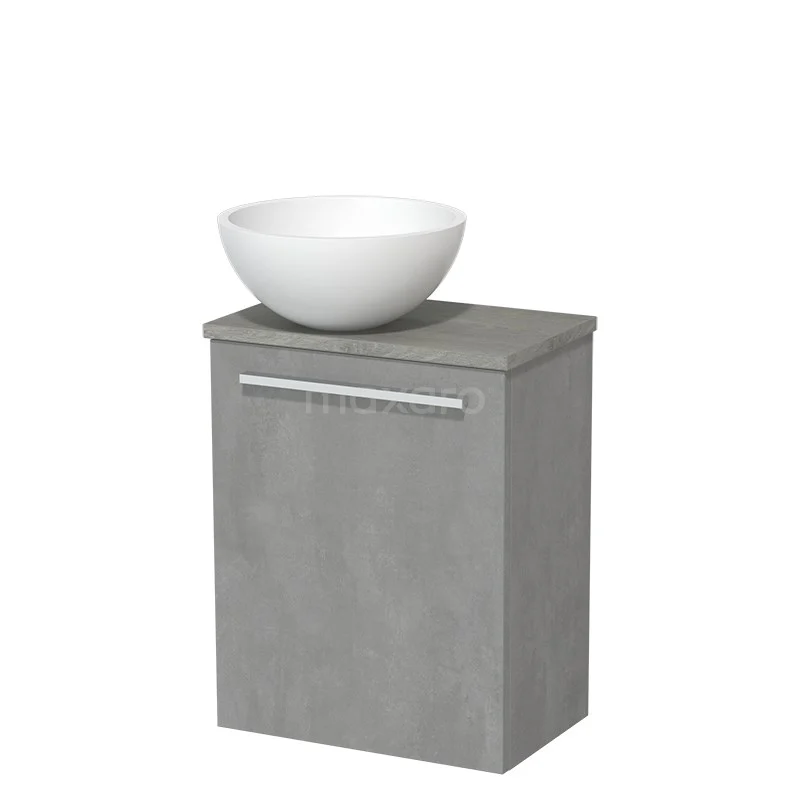 Grauer Badschrank mit weißem, schalenförmigem Waschbecken, modernes Design, Betonlook, ideal für kompakte Bäder.