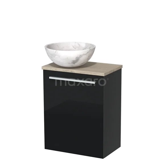 WC-Möbel mit Aufsatzwaschbecken | 41 cm Hochglanz Schwarz Glatte Front Weißer Marmor Naturstein Aufsatzwaschbecken Hellgraue Eiche Platte