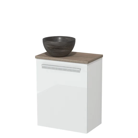 WC-Möbel mit Aufsatzwaschbecken | 41 cm Hochglanz Weiß Glatte Front Blaustein Naturstein Aufsatzwaschbecken Eiche Platte