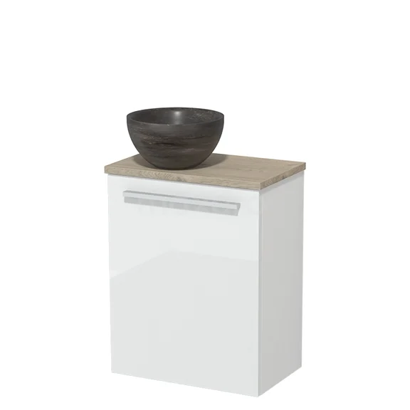 WC-Möbel mit Aufsatzwaschbecken | 41 cm Hochglanz Weiß Glatte Front Blaustein Naturstein Aufsatzwaschbecken Hellgraue Eiche Platte
