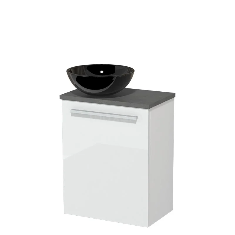 WC-Möbel mit Aufsatzwaschbecken | 41 cm Hochglanz Weiß Glatte Front Hochglanz Schwarz Keramik-Aufsatzwaschbecken Dunkelgrauer Beton Platte