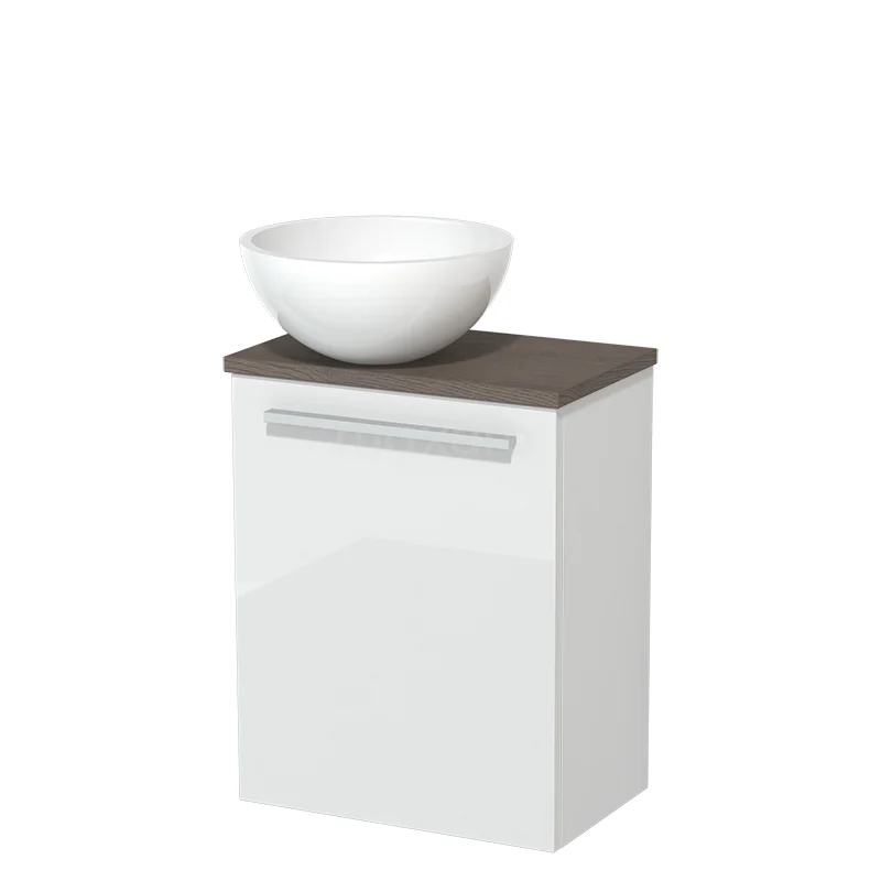 WC-Möbel mit Aufsatzwaschbecken | 41 cm Hochglanz Weiß Glatte Front Hochglanz Weiß Mineralguss Aufsatzwaschbecken Dunkelbraune Eiche