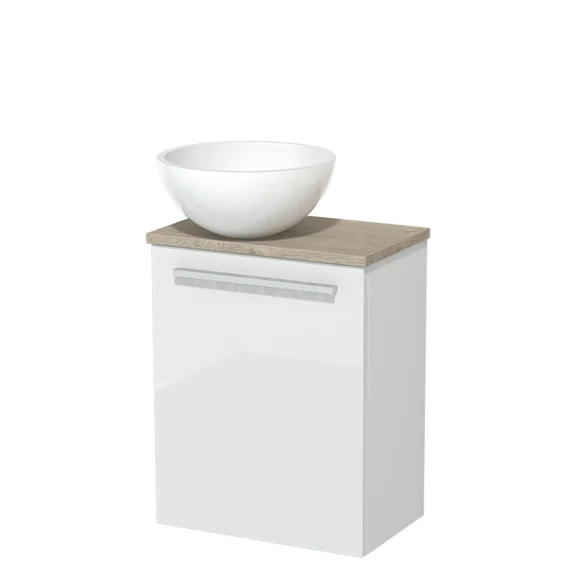 WC-Möbel mit Aufsatzwaschbecken | 41 cm Hochglanz Weiß Glatte Front Hochglanz Weiß Mineralguss Aufsatzwaschbecken Hellgraue Eiche Platte