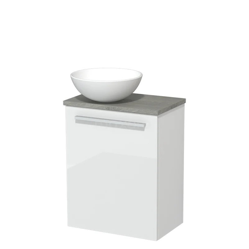WC-Möbel mit Aufsatzwaschbecken | 41 cm Hochglanz Weiß Glatte Front Matt Weiß Keramik Aufsatzwaschbecken Graue Eiche Platte