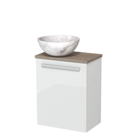 WC-Möbel mit Aufsatzwaschbecken | 41 cm Hochglanz Weiß Glatte Front Weißer Marmor Naturstein Aufsatzwaschbecken Eiche Platte