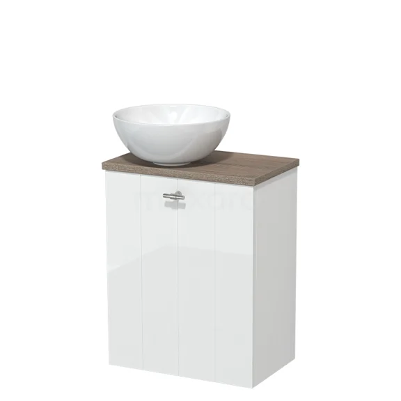 WC-Möbel mit Aufsatzwaschbecken | 41 cm Hochglanz Weiß Lamellen Front Hochglanz Weiß Keramik Aufsatzwaschbecken Eiche Platte