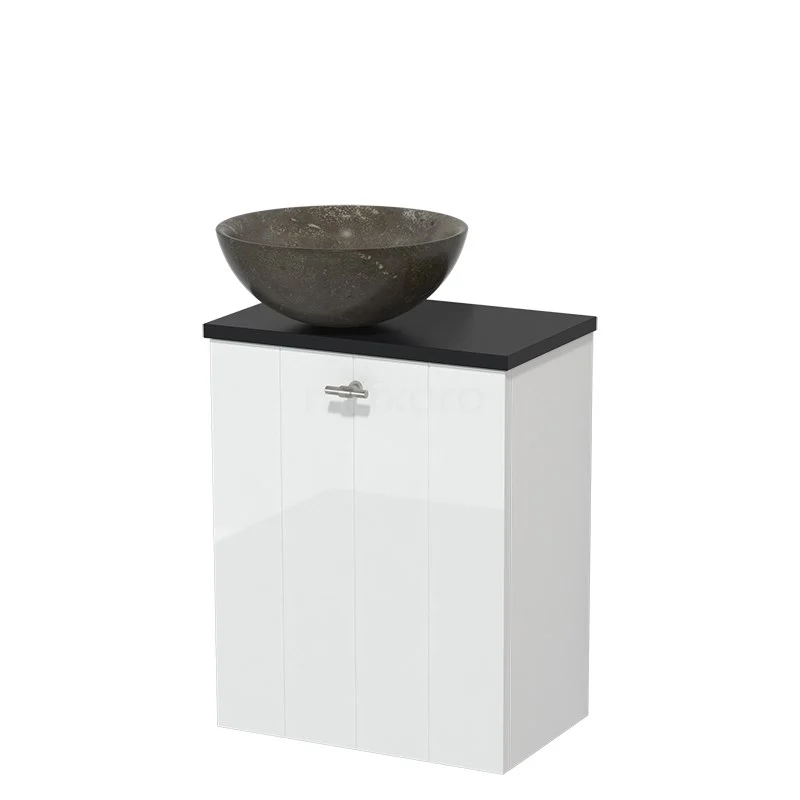 WC-Möbel mit Aufsatzwaschbecken | 41 cm Hochglanz Weiß Lamellenfront Blaustein Aufsatzwaschbecken aus Naturstein Matt Schwarz