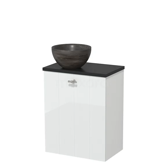 WC-Möbel mit Aufsatzwaschbecken | 41 cm Hochglanz Weiß Lamellenfront Blaustein Aufsatzwaschbecken aus Naturstein Matt Schwarz
