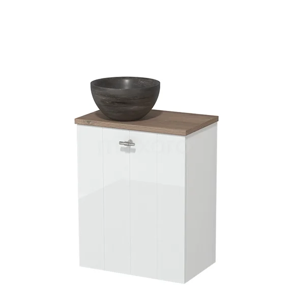 WC-Möbel mit Aufsatzwaschbecken | 41 cm Hochglanz Weiß Lamellenfront Blaustein Naturstein Aufsatzwaschbecken Mittelbraune Eiche