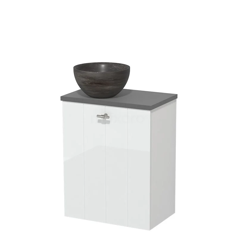 WC-Möbel mit Aufsatzwaschbecken | 41 cm Hochglanz Weiß Lamellenfront Blaustein Natursteinbecken Mittelgraue Platte