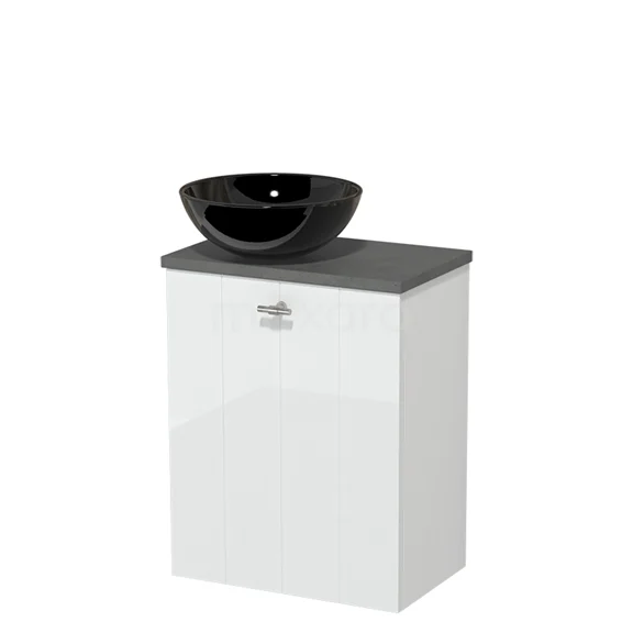 WC-Möbel mit Aufsatzwaschbecken | 41 cm Hochglanz Weiß Lamellenfront Hochglanz Schwarz Keramik-Aufsatzwaschbecken Dunkelgrauer Beton Platte