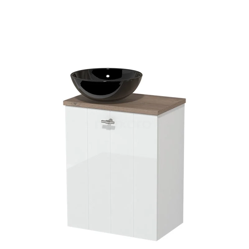WC-Möbel mit Aufsatzwaschbecken | 41 cm Hochglanz Weiß Lamellenfront Hochglanz Schwarz Keramik Aufsatzwaschbecken Mittelbraune Eiche