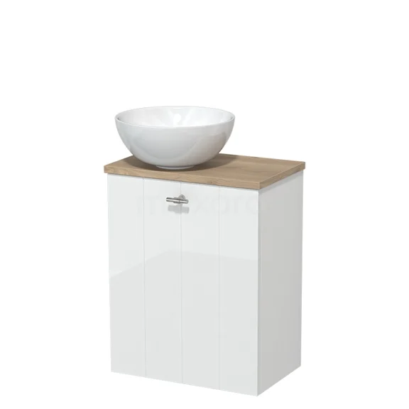 WC-Möbel mit Aufsatzwaschbecken | 41 cm Hochglanz Weiß Lamellenfront Hochglanz Weiß Keramik Aufsatzwaschbecken Hellbraune Eiche Platte