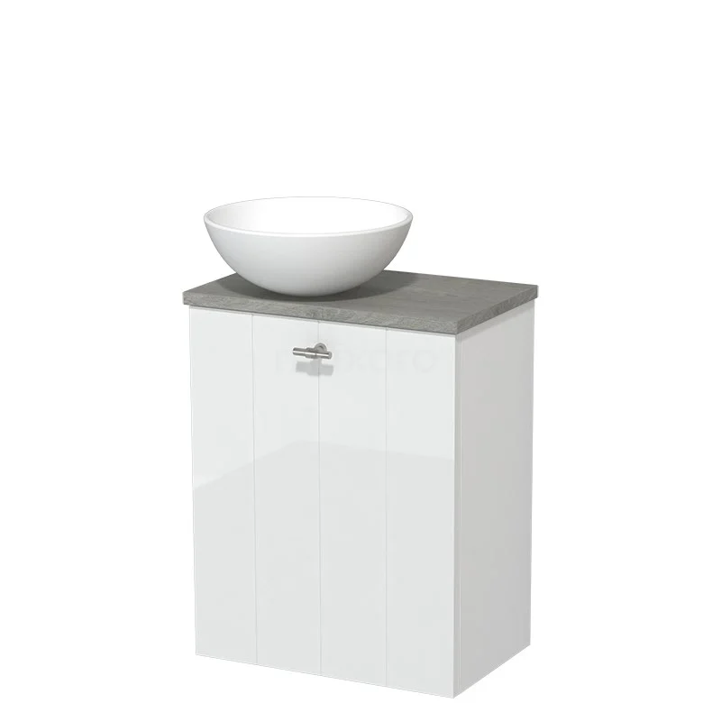 WC-Möbel mit Aufsatzwaschbecken | 41 cm Hochglanz Weiß Lamellenfront Matt Weiß Keramik Aufsatzwaschbecken Graue Eiche Platte