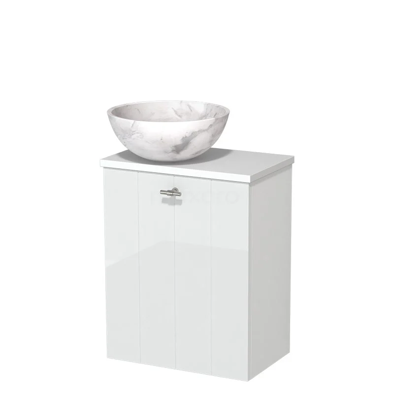 WC-Möbel mit Aufsatzwaschbecken | 41 cm Hochglanz Weiß Lamellenfront Weißer Marmor Naturstein Aufsatzwaschbecken Matt Weiß Platte