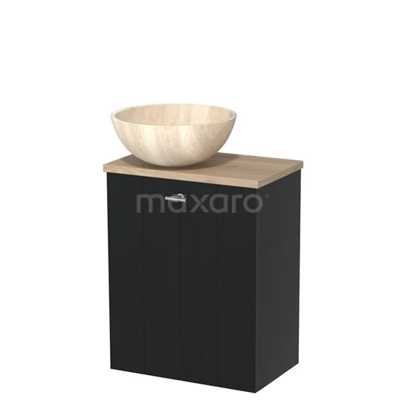 WC-Möbel mit Aufsatzwaschbecken | 41 cm Matt Schwarz Lamellen Front Travertin Naturstein Aufsatzwaschbecken Hellbraune Eiche Platte