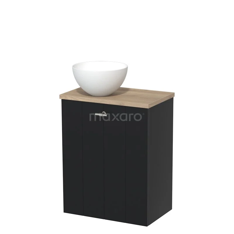 WC-Möbel mit Aufsatzwaschbecken | 41 cm Matt Schwarz Lamellenfront Matt Weiß Solid Surface Aufsatzwaschbecken Hellbraune Eiche Platte